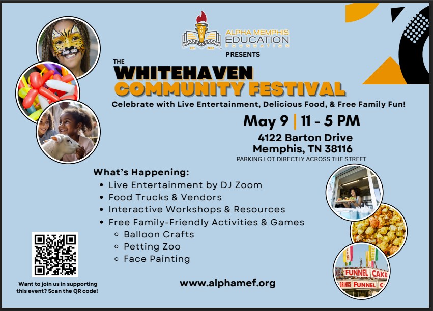 Join the Alpha Memphis Education Foundation for a day of fun, community, and empowerment at the Whitehaven Community Festival! Happening on May 9th at 4122 Barton Ave, this event promises something for everyone. Come support our youth and enjoy a day filled with activities and entertainment.